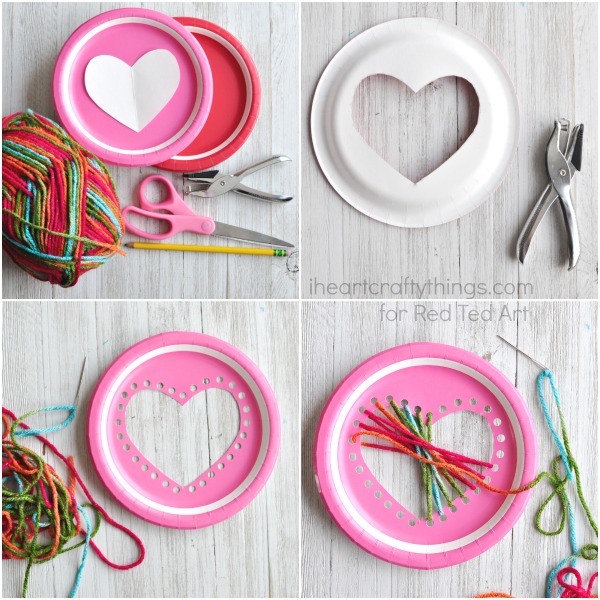 3. Pune un fir lung de lana in ac si incepe sa “cosi” inima trecand acul cu lana prin gaurile de pe marginea inimii. Atunci cand termini firul de lana din ac lipeste-l cu scotch de spatele farfuriei si continua apoi cu alt fir, pana cand treci lana prin toate gaurile inimii. Simplu, nu?