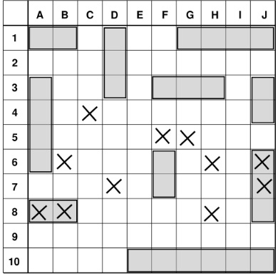 Fiecare va desena pe foaia lui (de preferat hartie matematica) doua tabele cu zece randuri si zece coloane, pe care le va nota cu cifre de la 1 la 10 (coloanele) si cu litere de la A la J (randurile).
