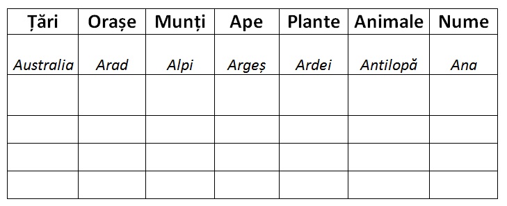 Se alege o litera, iar fiecare jucator trebuie sa scrie, pe foaia lui, cate un nume in dreptul fiecarei categorie. Castiga cel care a terminat primul de scris nume pentru toate cele sapte categorii. Exemplu pentru litera A: Austria, Arad, Alpi, Arges, Ardei, Antilopa, Ana.
