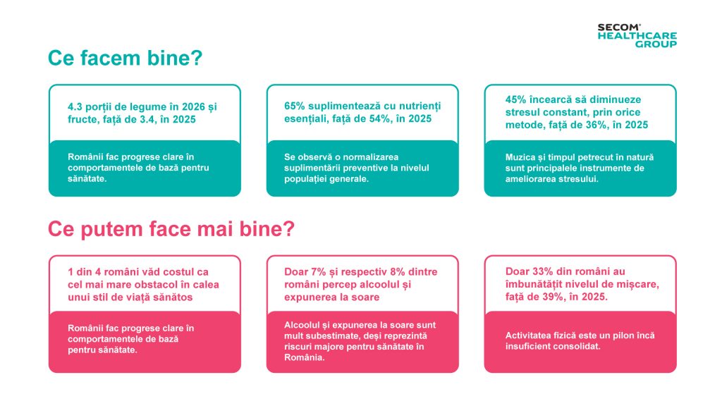 București, 22 aprilie 2026Pentru 25% dintre români, cel mai mare obstacol în menținerea unui stil de viață sănătos este costul perceput. Aceasta este una dintre concluziile studiului Prevenția ca stil de viață în România 2026*, realizat recent de ISRA Center Marketing Research la cererea Secom® Healthcare Group. Datele vin într-un context dificil, România având una dintre cele mai ridicate rate de mortalitate evitabilă din UE, fiind pe locul al treilea la decesele ce pot fi prevenite prin politici de sănătate publică și pe primul loc la cele ce pot fi tratate prin intervenții medicale la timp, conform raportului Starea Sănătății în UE 2025.[1]