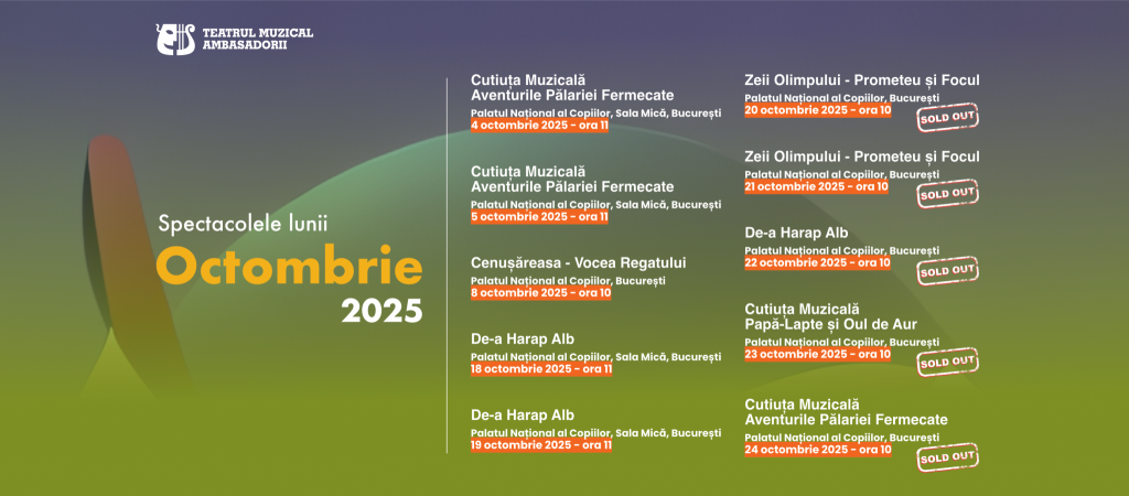 Luna octombrie se arată a fi una de excepție pentru Teatrul Muzical Ambasadorii: 8 spectacole sunt SOLD OUT, semn că micii spectatori și familiile lor iubesc să descopere povești, muzică și lecții valoroase prin intermediul teatrului.