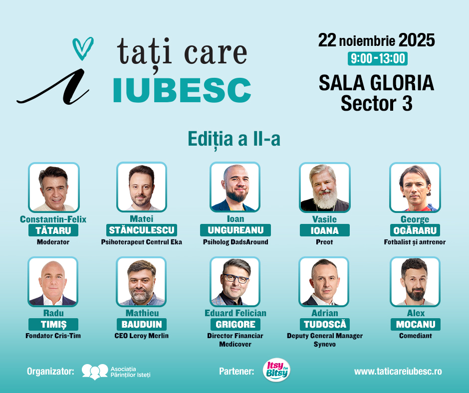 Tații sunt așteptați sâmbătă, 22 noiembrie 2025, la Sala Gloria din Sector 3, București, la a doua ediție a evenimentului Tați care iubesc!