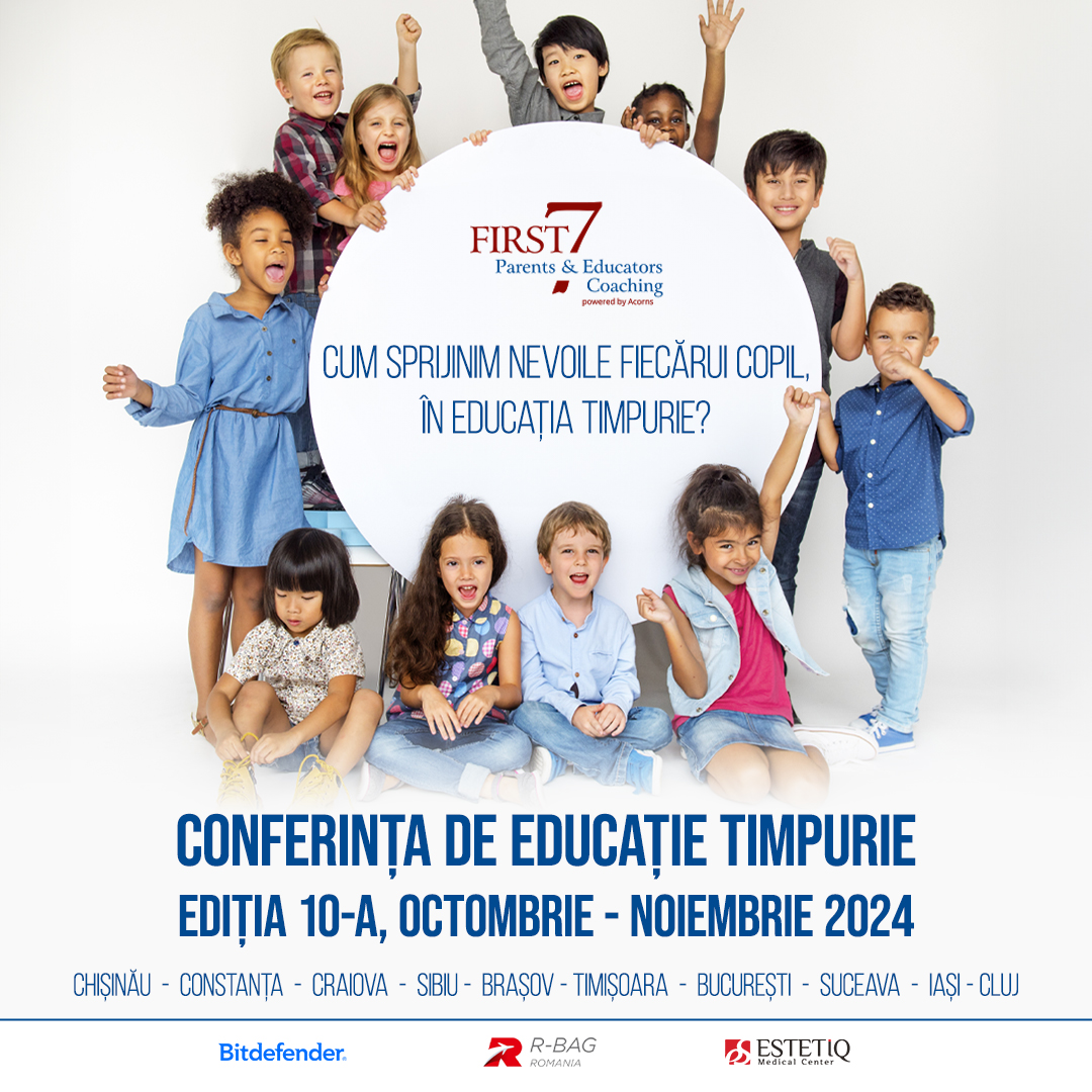 În perioada 12 octombrie – 9 noiembrie 2024 se desfășoară cea de-a X-a ediție a Conferinței de Educație Timpurie First7 2024, în zece orașe din România și Republica Moldova. Evenimentul reunește experți locali și internaționali în educația preșcolară cu scopul de a transmite bune practici și soluții concrete în procesul de predare din acest segment.