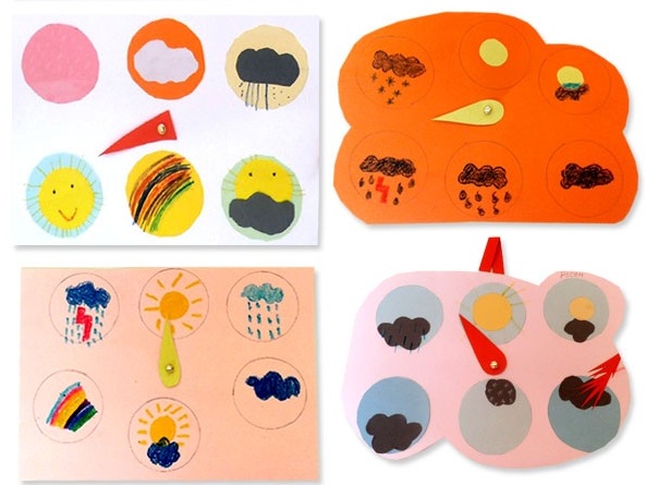 Poti folosi ca material didactic un ceas meteorologic, vesel si colorat, pe care cel mic sa-l realizeze si sa-l foloseasca apoi pentru a stabili in fiecare zi starea vremii.