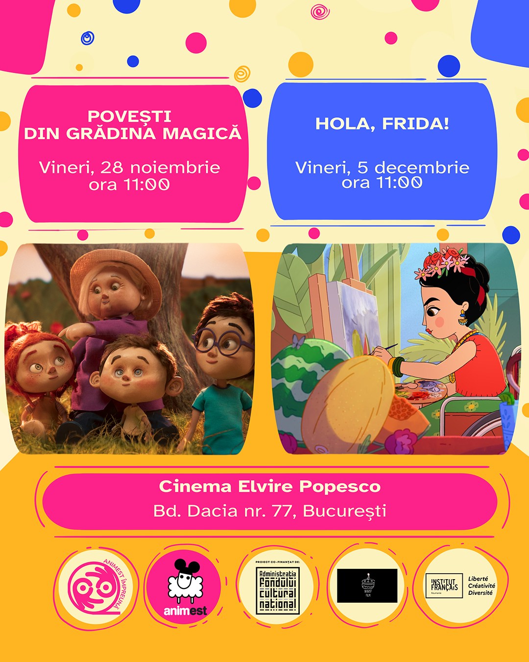 Ultima proiecție din cadrul proiectului „Emoții animate” va avea loc în Ajun de Moș Nicolae, vineri 5 decembrie, de la ora 11:00 și aduce pe marile ecrane prima poveste animată despre copilăria celebrei artiste mexicane Frida Kahlo. Regizat de André Kadi și Karine Vezina, Hola, Frida! propune un univers vizual plin de culoare, ancorat în evoluția stării de spirit a eroinei, o poveste despre puterea imaginației și a creativității ca instrumente de vindecare și de autodescoperire. Filmul, adus pe ecranele din România în parteneriat cu August Film, va fi prezentat în varianta accesibilizată bilingv, pentru spectatori surzi și auzitori. Bilete sunt disponibile aici.