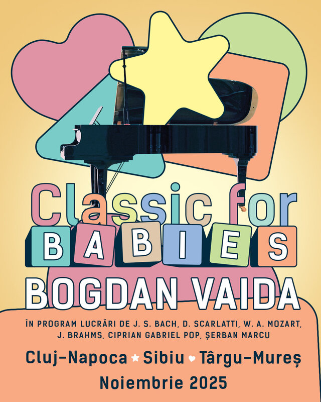 Classic for Babies este un experiment care privește primele contacte cu muzica și legătura dintre părinți și copii. Fiecare sesiune va fi o experiență senzorială unică, menită să aducă bucurie și relaxare atât micuților, cât și părinților. Aici părinții pot veni fără grija că micuțul ar putea deranja alți participanți”, spune pianistul și inițiatorul proiectului, Bogdan Vaida.