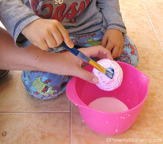 Amesteca intr-un castron aracetul si apa pana obtii o pasta mai subtire putin decat smantana. Desfa lana de pe ghem si inmoaie-o in solutia de aracet, apoi prinde un capat al firului de gura balonului si infasoara balonul in lana. Dupa ce e gata, mai da-i balonului un strat de solutie de aracet folosind pensula.