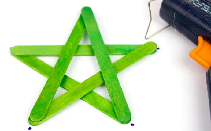 Pentru fiecare steluta ai nevoie de cinci bete. Iti recomandam sa aranjezi betele in forma de stea inainte sa le lipesti. Astfel le poti ajusta pozitia si poti face chiar semne pe o foaie de hartie, ca sa-ti fie usor.