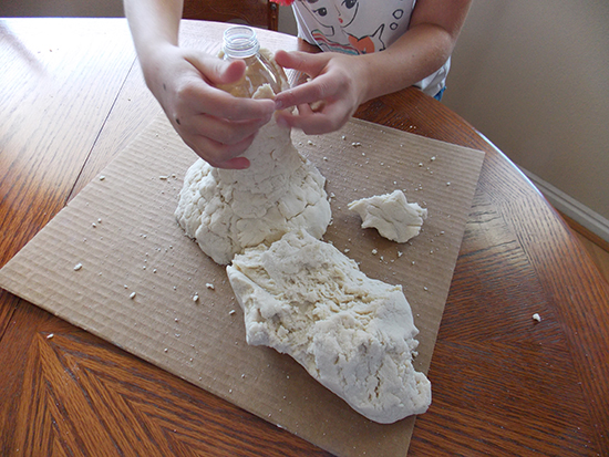 Alege o tava cat de cat adanca, pe care sa o folosesti drept suport pentru experiment. Pune in mijlocul ei sticla de plastic si lasa-i pe copii sa construiasca vulcanul in jurul ei, folosind coca din faina si sare.