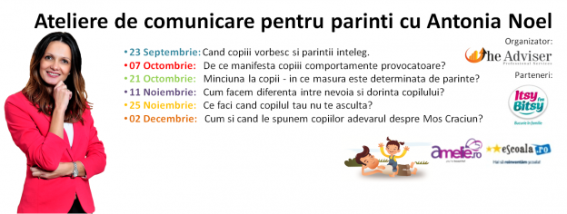 Pe 21 octombrie, esti asteptat(a) la un nou atelier, alaturi de trainerul Antonia Noel, unde poti invata cum sa ai un copil autodisciplinat, responsabil, iubitor, cooperant si capabil sa faca alegeri constient.