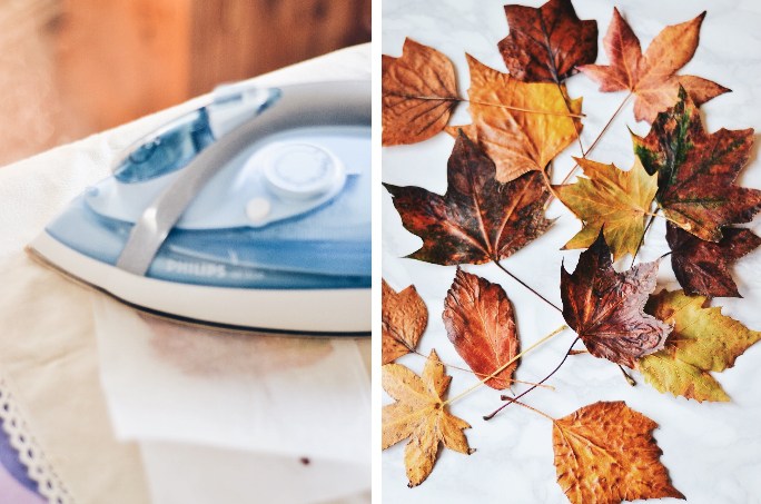 Lasa fierul sa se incalzeasca la o treapta inalta. Intinde o bucata de hartie cerata pe suprafata de calcat si aseaza pe ea frunzele, intr-un singur strat, iar apoi o noua coala de hartie cerata peste ele. Calca usor cu fierul coala de hartie cerata timp de 20-30 de secunde, apoi intoarce usor “sandvisul” pe partea cealalta si repeta procedura.