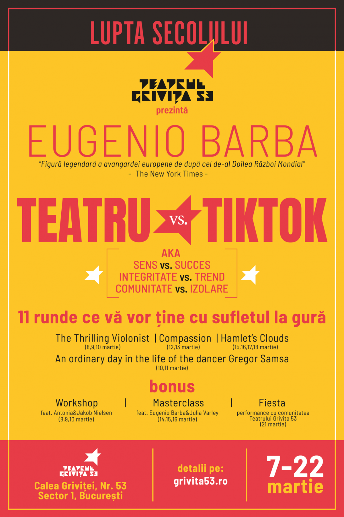 Fondator al Odin Teatret, creator al teatrului antropologic și una dintre figurile centrale ale avangardei teatrale europene postbelice, plin de vitalitate și profund implicat în fenomenul teatral de astăzi, Eugenio Barba sărbătorește 90 de ani și alege Teatrul Grivița 53 pentru acest eveniment unic într-un moment de maximă importanță pentru demersul nostru. Prezența sa poziționează Teatrul Grivița 53 într-un context internațional de referință.