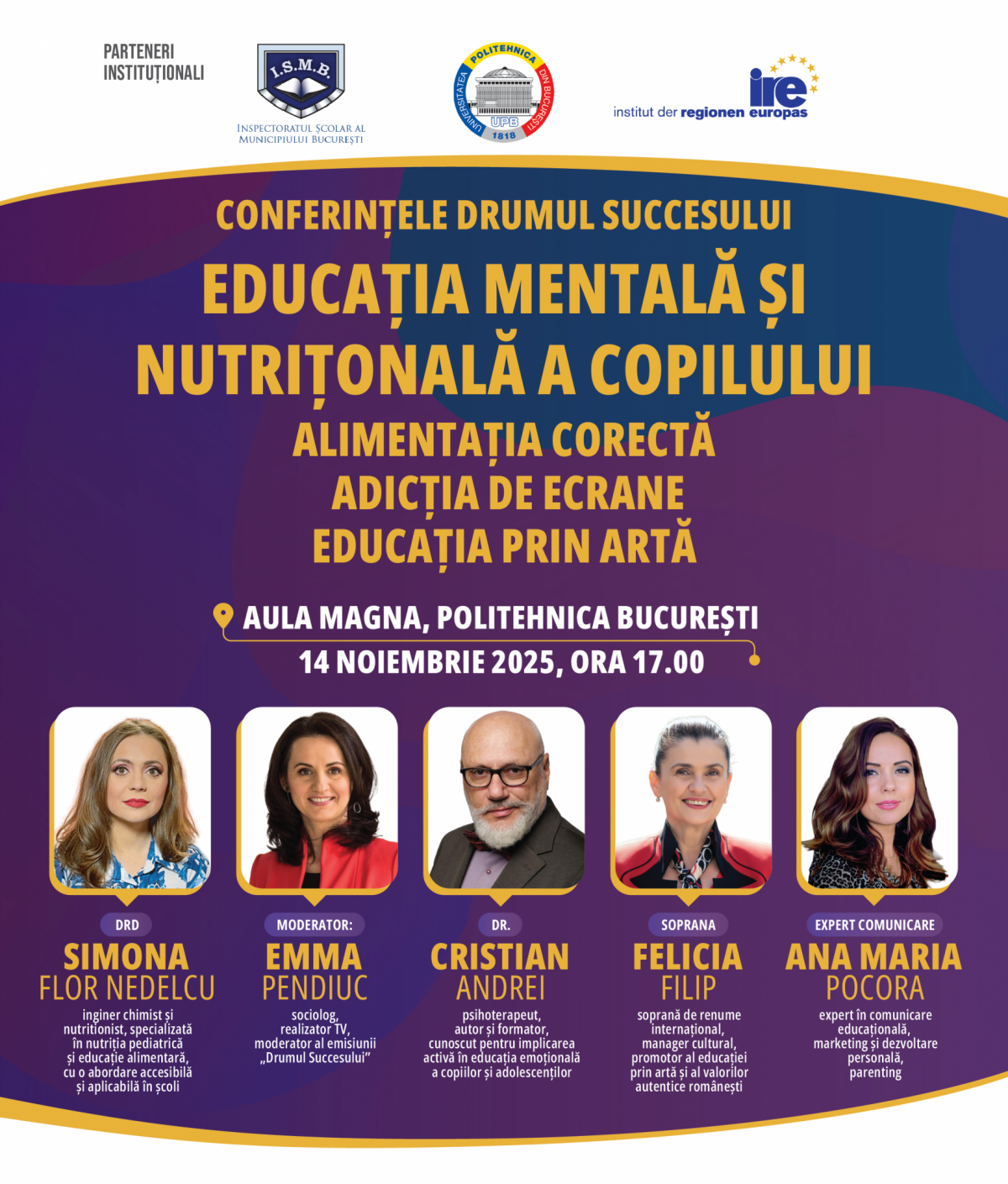 Cadrele didactice și părinții sunt invitați să participe, pe 14 noiembrie, la Aula Magna a Universității Politehnica București, la conferința „Educația mentală și nutrițională a copilului – Alimentația corectă, adicția de ecrane, educația prin artă”.