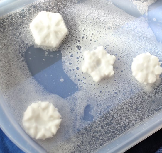 „Fulgii” se vor topi sfaraind precum pastilele efervescente, ca urmare a reactiei chimice dintre bicarbonat si otet.