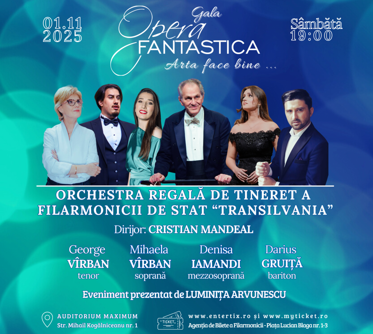 Desfășurată sub motto-ul „Arta face bine”, noua ediție a Galei Opera Fantastică va fi prezentată de muzicolog dr. Luminița Arvunescu și susținută de Orchestra Regală de Tineret a Filarmonicii de Stat ”Transilvania” – aflată sub conducerea excepționalului dirijor Cristian Mandeal, avându-i ca invitați pe: soprana Mihaela Vîrban, mezzosoprana Denisa Iamandi, tenorul George Vîrban și baritonul Darius Gruiță.