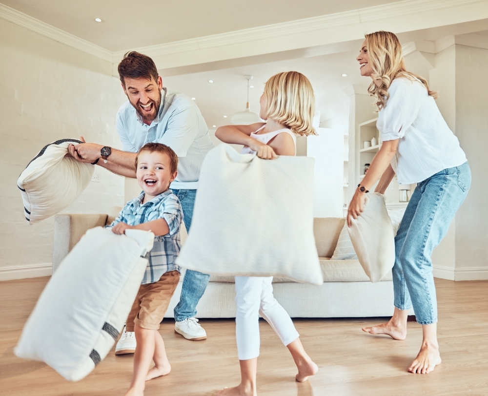 - Jocul cu perne – o luptă ușoară cu perne poate fi o modalitate sigură de descărcare a tensiunilor acumulate peste zi. Se stabilește o regulă clară: nu lovim tare și ne oprim dacă cineva spune „stop”.
