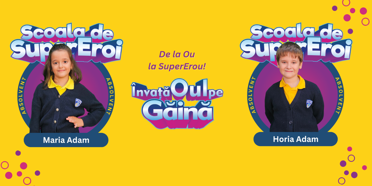 Maria și Horia Adam sunt frați gemeni, au 8 ani și sunt studenții săptămânii 20-23 octombrie la Școala de SuperEroi Itsy Bitsy – Învață oul pe găină, ediția a zecea.