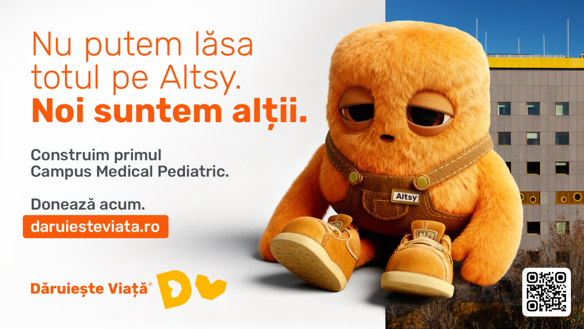 Poți fi și tu Altsy. Intră pe daruiesteviata.ro și donează pentru Campusul Medical Pediatric pe care îl construim împreună. Sau dă un share campaniei, vorbește-le celor apropiați despre Alții/Altsy, nu-l lăsa să ducă singur tot greul. Împreună suntem Altsy.