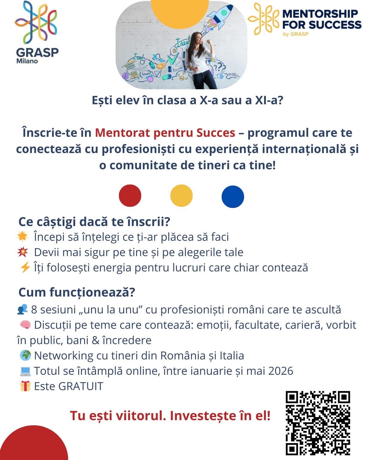 GRASP Milano a deschis oficial selecția pentru a VII-a ediție a programului „Mentorat pentru Succes”, adresat elevilor români de 16–17 ani. Programul a fost premiat în 2025 drept “Cel mai bun proiect pentru tineri realizat în diaspora” la Gala “Lideri pentru Liderași” Powered by Radio Itsy și a ajutat peste 100 de adolescenți să se dezvolte personal, alături de profesioniști români din Italia și nu numai.