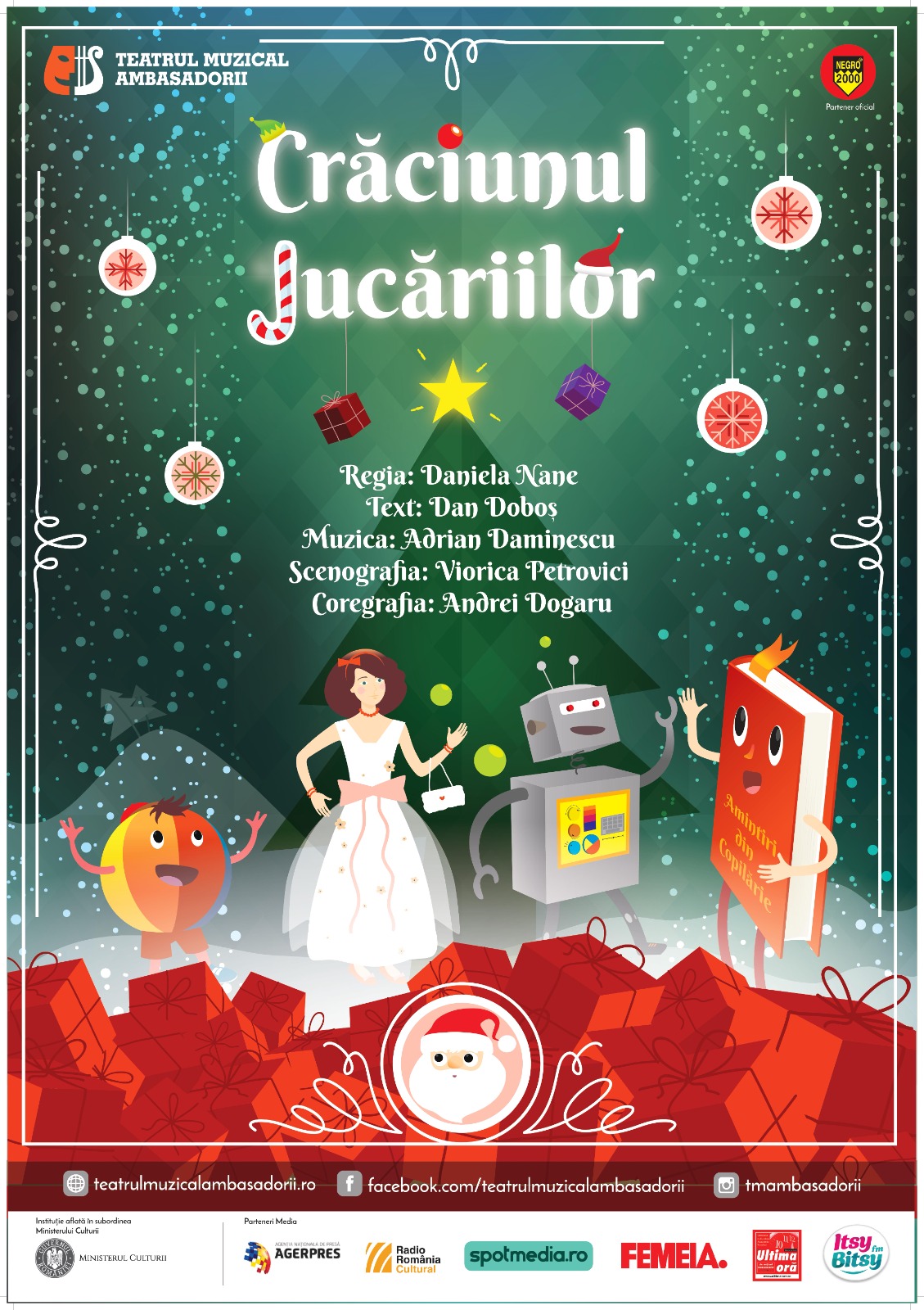 Duminica, 19 decembrie, de la ora 17:00 , va veti putea bucura de „Craciunul jucariilor”, un musical plin de armonie, culoare si umor, pus in scena de Daniela Nane, iar luni, 20 decembrie, de la ora 11:00, „Renii lui Mos Craciun” le spun copiilor povesti muzicale intr-un spectacol original de revista pentru copii, regizat de Laura Maria Vladoiu, dupa un scenariu gandit de Smaranda Oteanu-Bunea.
