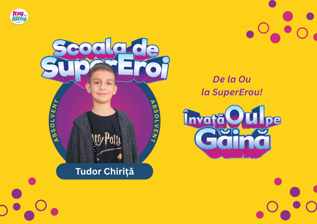 Tudor Chiriță are 9 ani și vine ca student, în perioada 17-20 noiembrie, la Școala de SuperEroi Itsy Bitsy – Învață oul pe găină.
