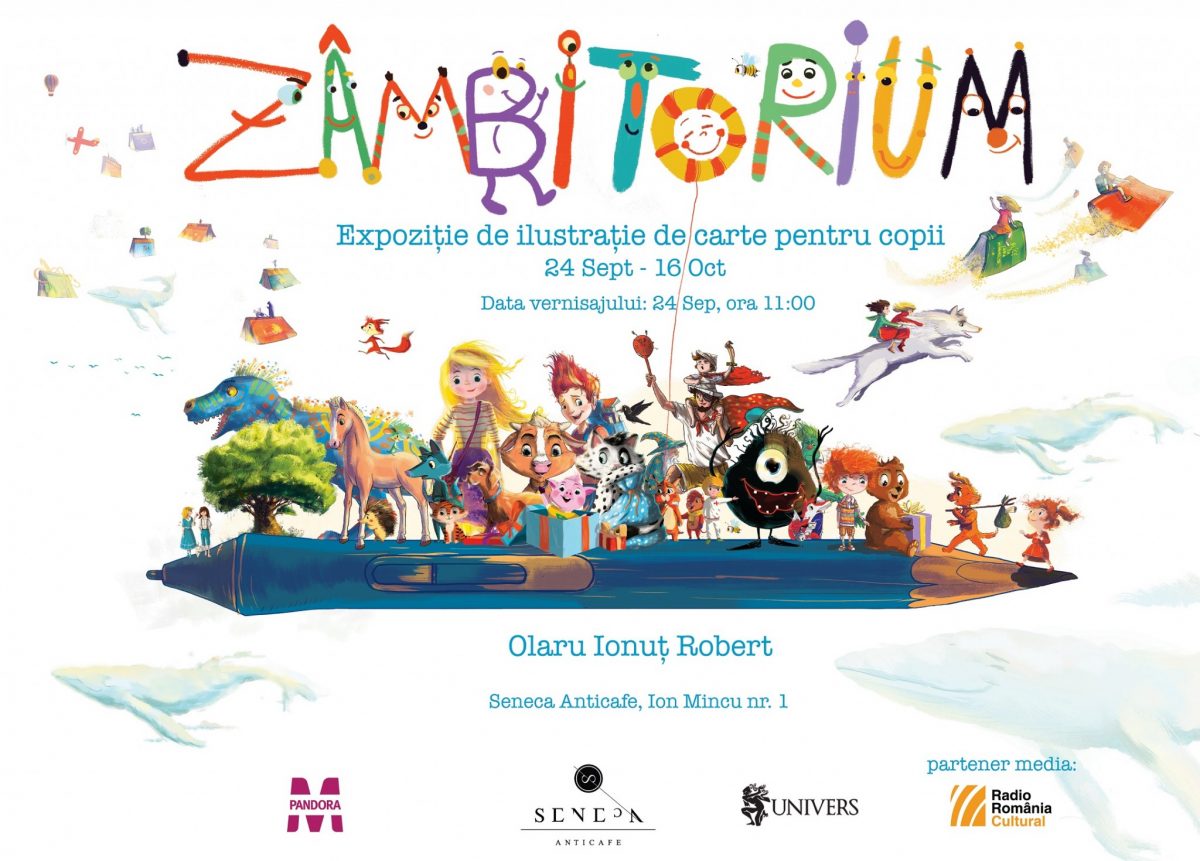 ”ZÂMBITORIUM s-a născut dintr-o idee care a prins formă și a crescut organic încă de la primele cărți pe care le-am ilustrat. Pe măsură ce personajele acestor cărți – de la gâze și iepuri la creaturi fantastice, de poveste – căpătau viață pe hârtie, mi s-a părut firesc să le adun laolaltă într-o expoziție, pentru bucuria mea și a copiilor care le îndrăgesc. ZÂMBITORIUM este insula pe care s-au întâlnit personajele mele – un loc în care privitorul de orice vârstă ia o pauză din ritmul cotidian, zâmbește și se încarcă cu energie. Ilustrațiile prezente în expoziție fac parte din cărțile la care am lucrat până în prezent, publicate în cea mai mare parte la editura Panda:Cărți pentru copii și la editura Univers. Le-am creat atât în tehnica tradițională – desen în creioane colorate și acuarele – cât si sub formă de pictură digitală.” – Ionuț Robert Olaru, ilustrator.
